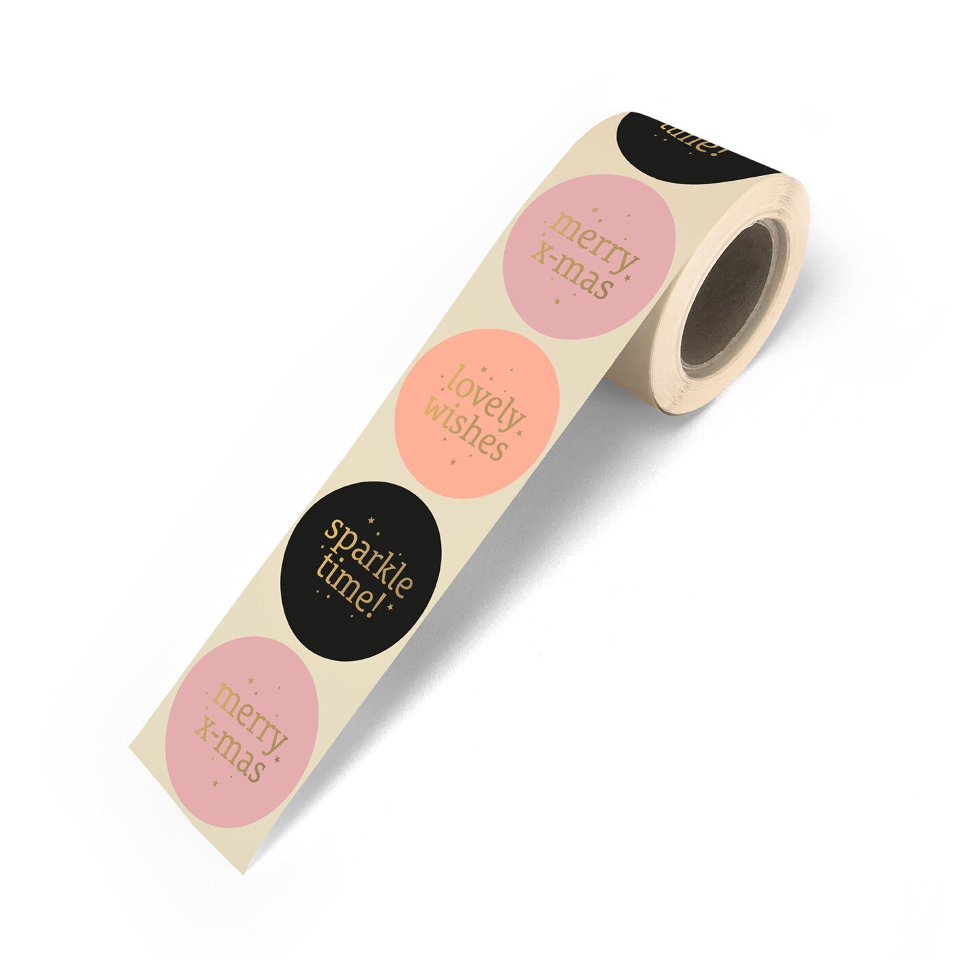 Leuke sluitstickers voor jouw kerstkaarten of ter decoratie op kerstcadeaus. De stickers bevatten de teksten: Merry x-mas, Sparkle time & lovely wishes in het roze, zwart & peach.
