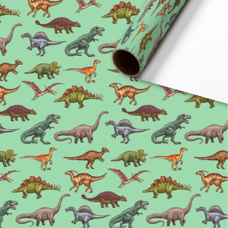 Stoer cadeaupapier voor jongens! Dit enkelzijdig bedrukte cadeaupapier bevat geïllustreerde dinosaurssen op een effen, mint groene achtergrond. Leuk voor verjaardagen & kinderfeestjes!