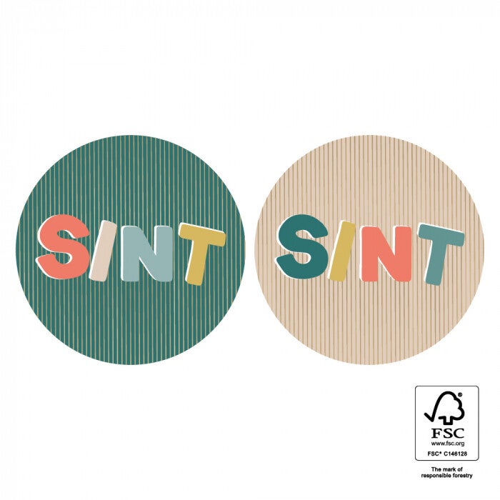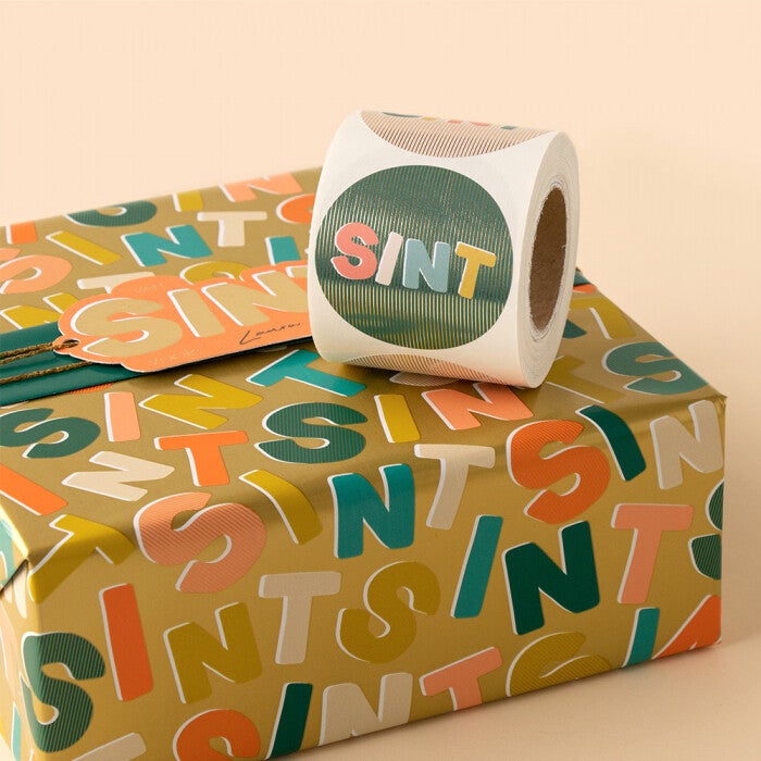 De sluitstickers hebben een goudfolie ondergrond en zijn voorzien van de letters 'SINT' in frisse kleuren.